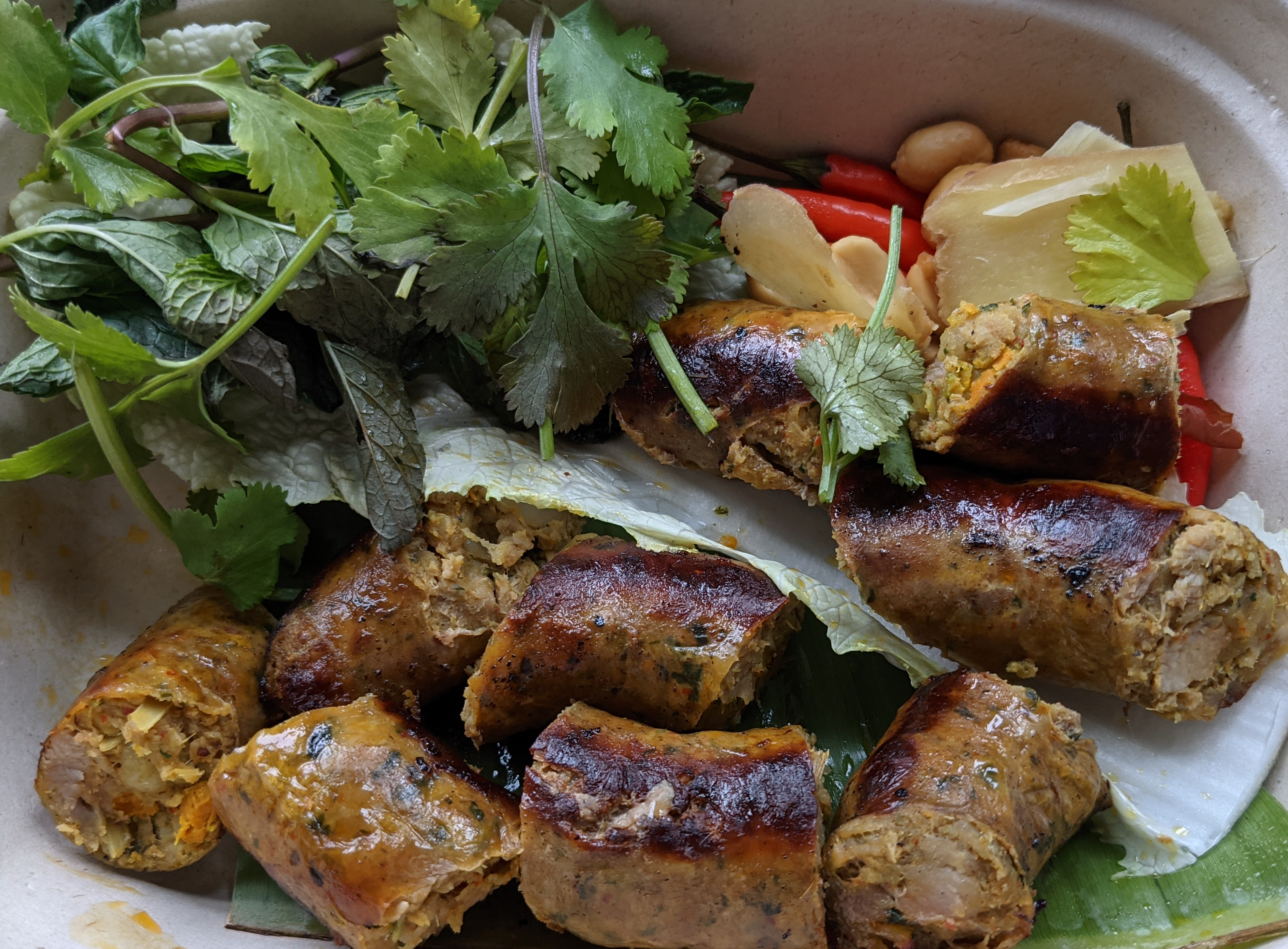 Next up was a true star: the Thai sausage. The herbal flavor packed inside was unique and absolutely delicious. The size of the dish was also great. My only question is if there was some way of eating this that I missed? The container was filled with raw Thai chilis, peanuts, cilantro sprigs, sliced ginger, and a single napa cabbage leaf along with the sausage itself. Were we supposed to chase the sausage with the chilis like some kind of unholy tequila shot? I just ate the peanuts. Maybe I’m doing it wrong?