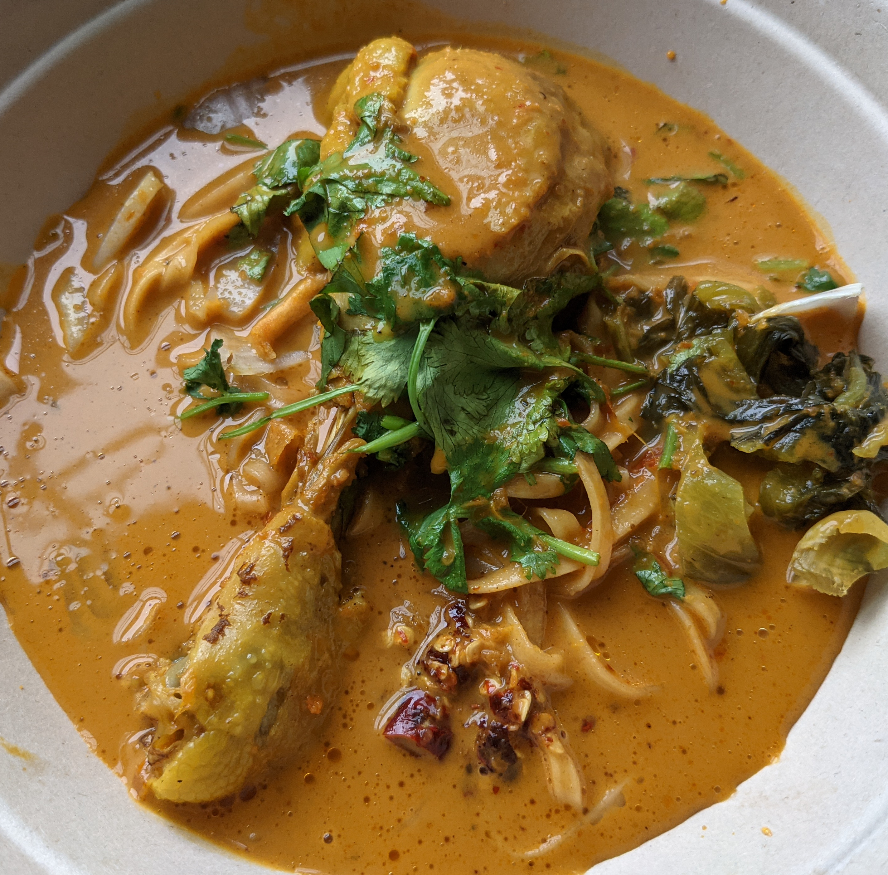 The pros: the coconutty broth was so rich and packed a good but not overpowering heat. The noodles were cooked well and the soup was packaged with the broth separate to preserve the integrity of the ingredients. It was topped with plenty of pickled mustard greens, a super underrated addition that contributed a necessary acidity.