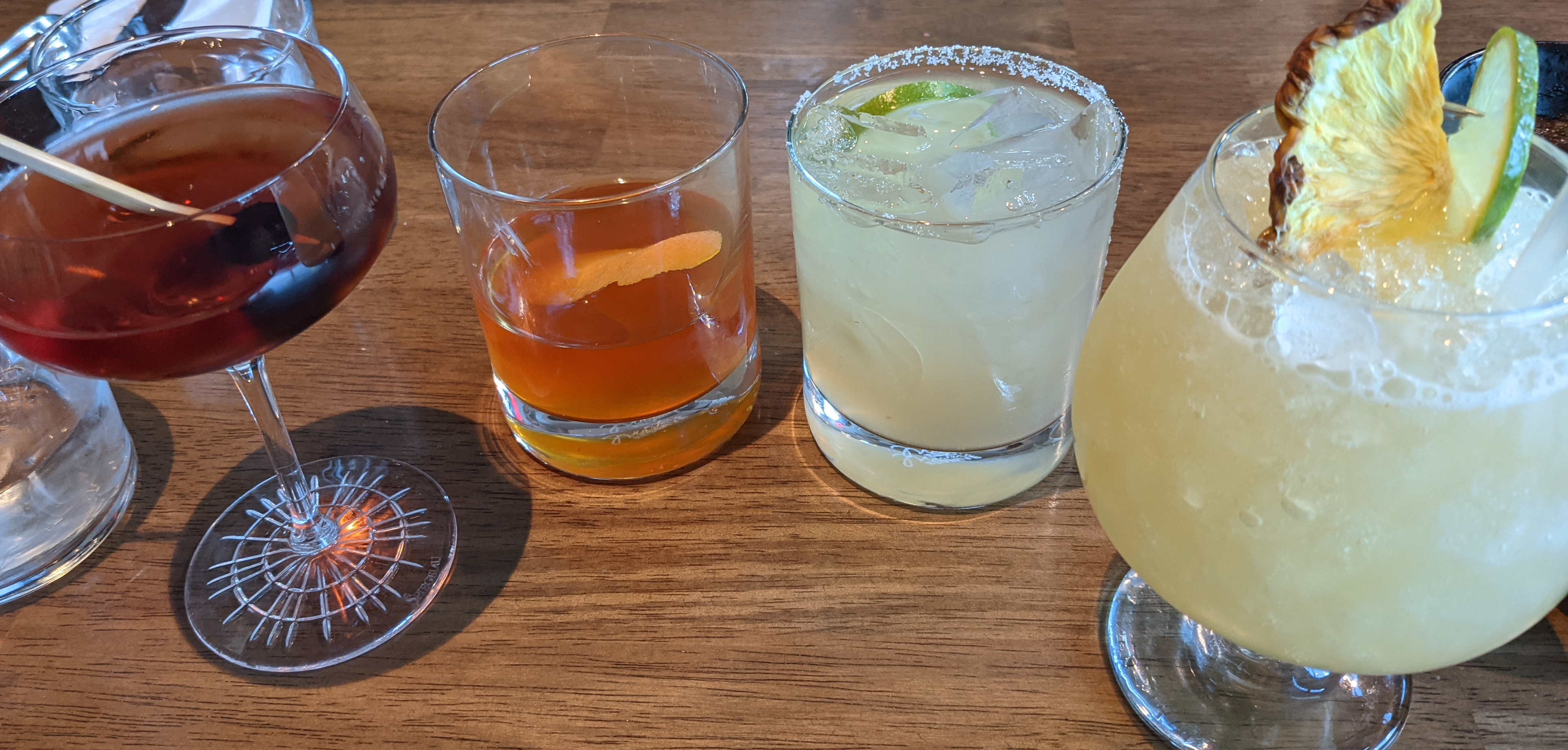 Left to right: my husband’s mezcal Manhattan (herbal, bitter, light smoke and spice), my FIL’s flor de luna (strong but surprisingly not a ton of the Laphroaig flavor came through), my MIL’s standard margarita (impossible to mess up), and my [not to scale, please don’t worry for my liver] La Mula, which just feels like something I should be drinking in the jungle treehouse in Belize where we got married. So far, so good. The chips and salsa are also recommended–fresh chips with tangy salsa verde, a big pot of smoky dip, and a spicy roja.