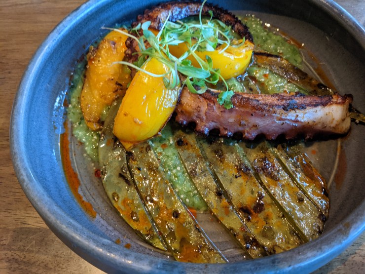 The pulpo was one thicccc tentacle, very crispy but a little too gummy on the fat end. It had a delicious spice and came with one perfectly griddled nopal paddle, tomatillo salsa, and those gorgeous golden tomatoes. This is a complete meal, but a meal for people with no food texture issues whatsoever! Do you like slimy foods? They got you!