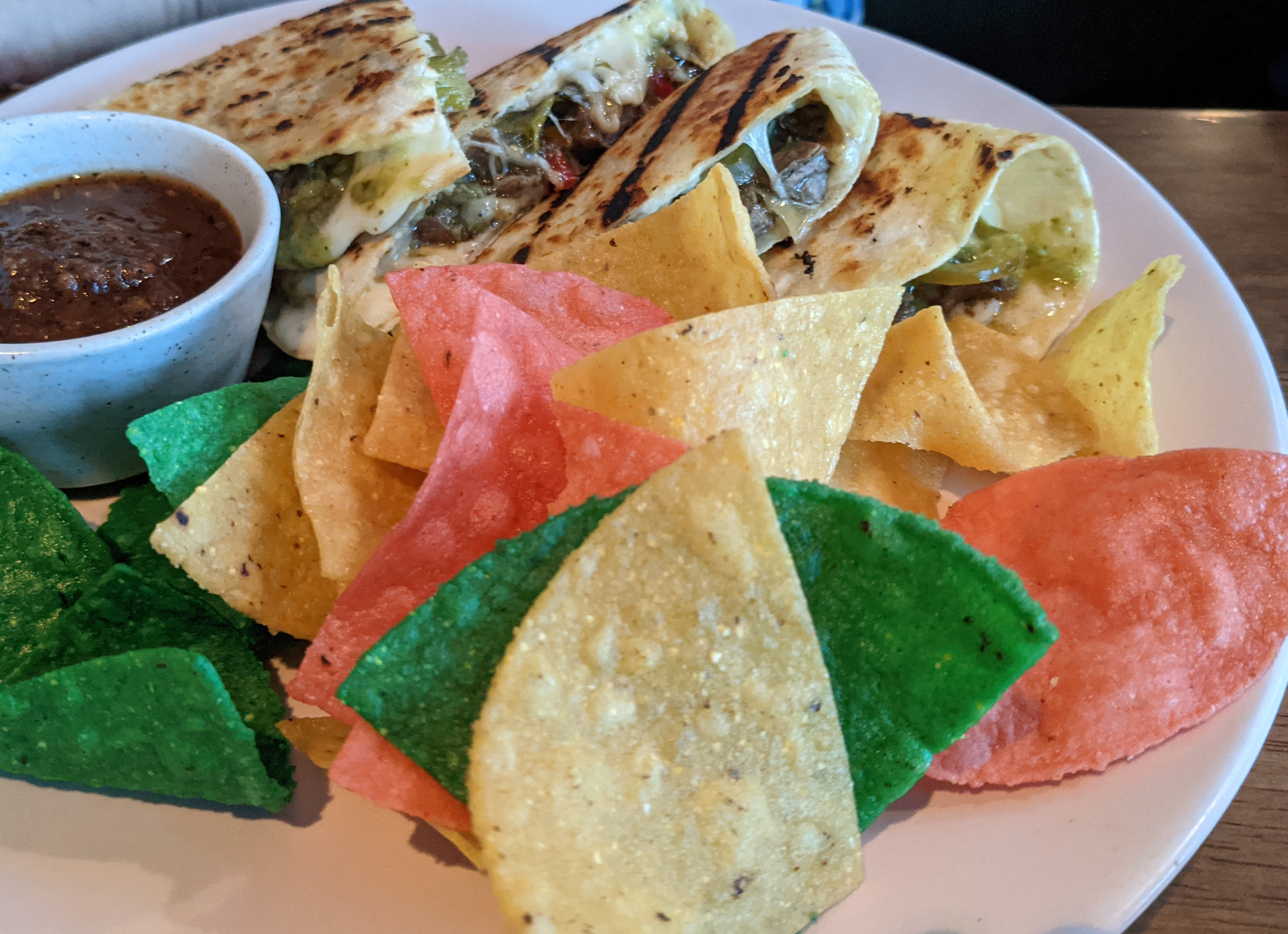 I had the pleasure of trying my father-in-law’s carne asada quesadilla. It was huge, on a beautiful fancy tortilla with plenty of cheese and tender grilled meat. I don’t think I’d order one for myself because quesadillas just remind me of something you cook when you are a) very drunk at 2 a.m., b) trying to stop a toddler from screaming, or c) both. But I’m sure it would please the quesadilla lover/drunkard/three year-old in your life.