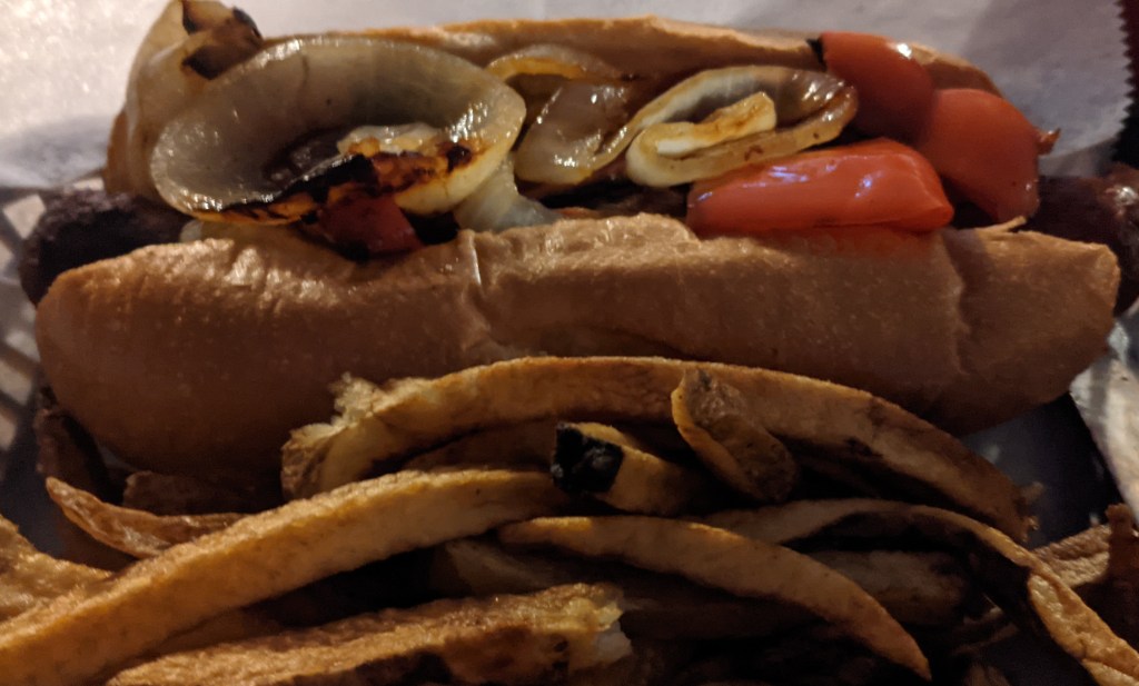 It took for.ev.er to get our entrees. I had long since finished my cocktail glass of watered-down tequila by the time the sandwiches appeared. I had gotten the sausage and peppers; my husband the BBLT.