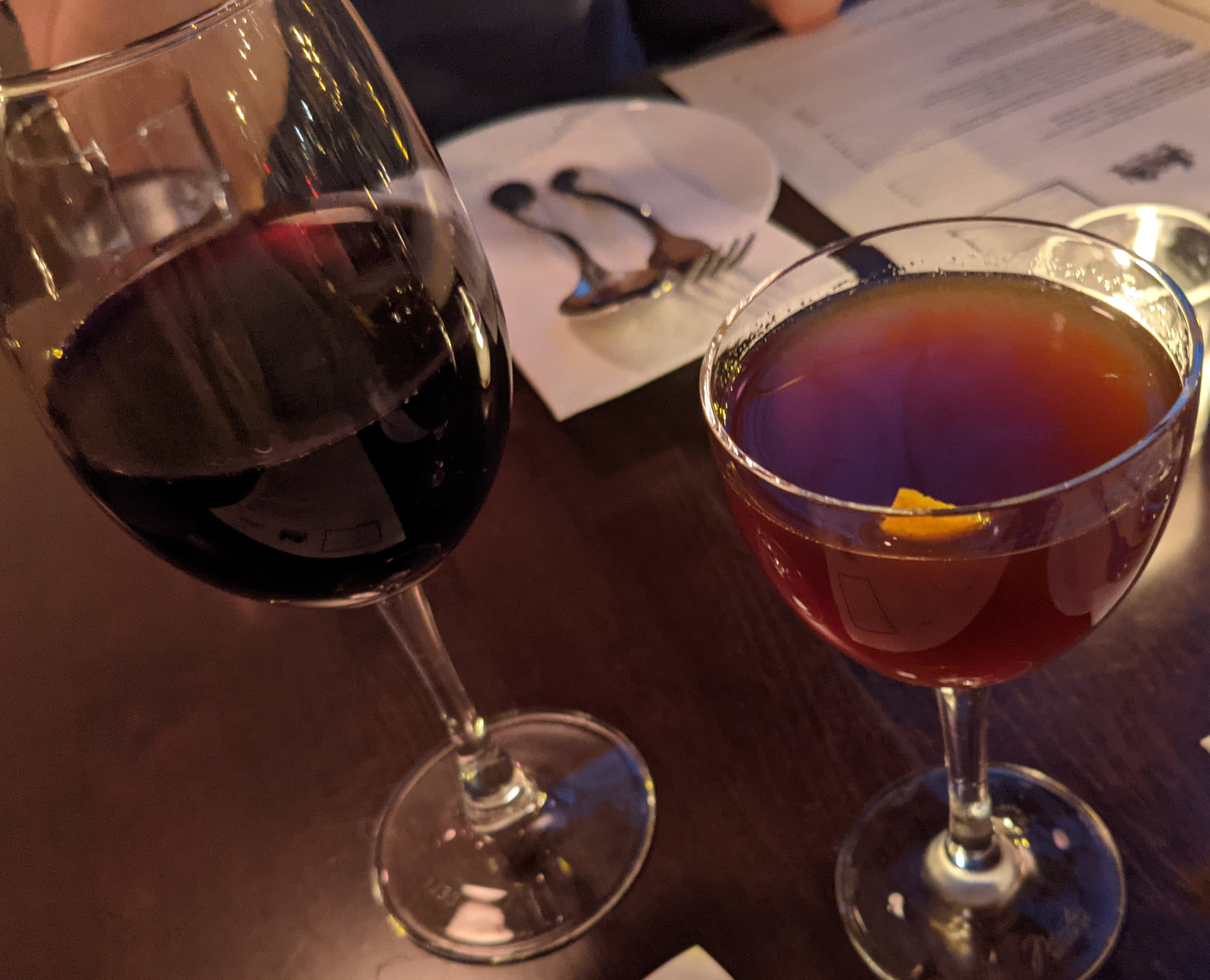 We started with drinks, and it was easy for me to pick the Smokestack Lightin’ (it turned out to be even easier to drink it than it was to pick, and a little too easy to order a second one). It has the sweet tang of tamarind and light smoke of the mezcal. The menu lists fennel as an ingredient, but don’t let that deter you; I couldn’t even find it when searching. My husband was happy to have a full-bodied, mouthfeel-y red wine, and it turned out to be a great pairing with our food order.