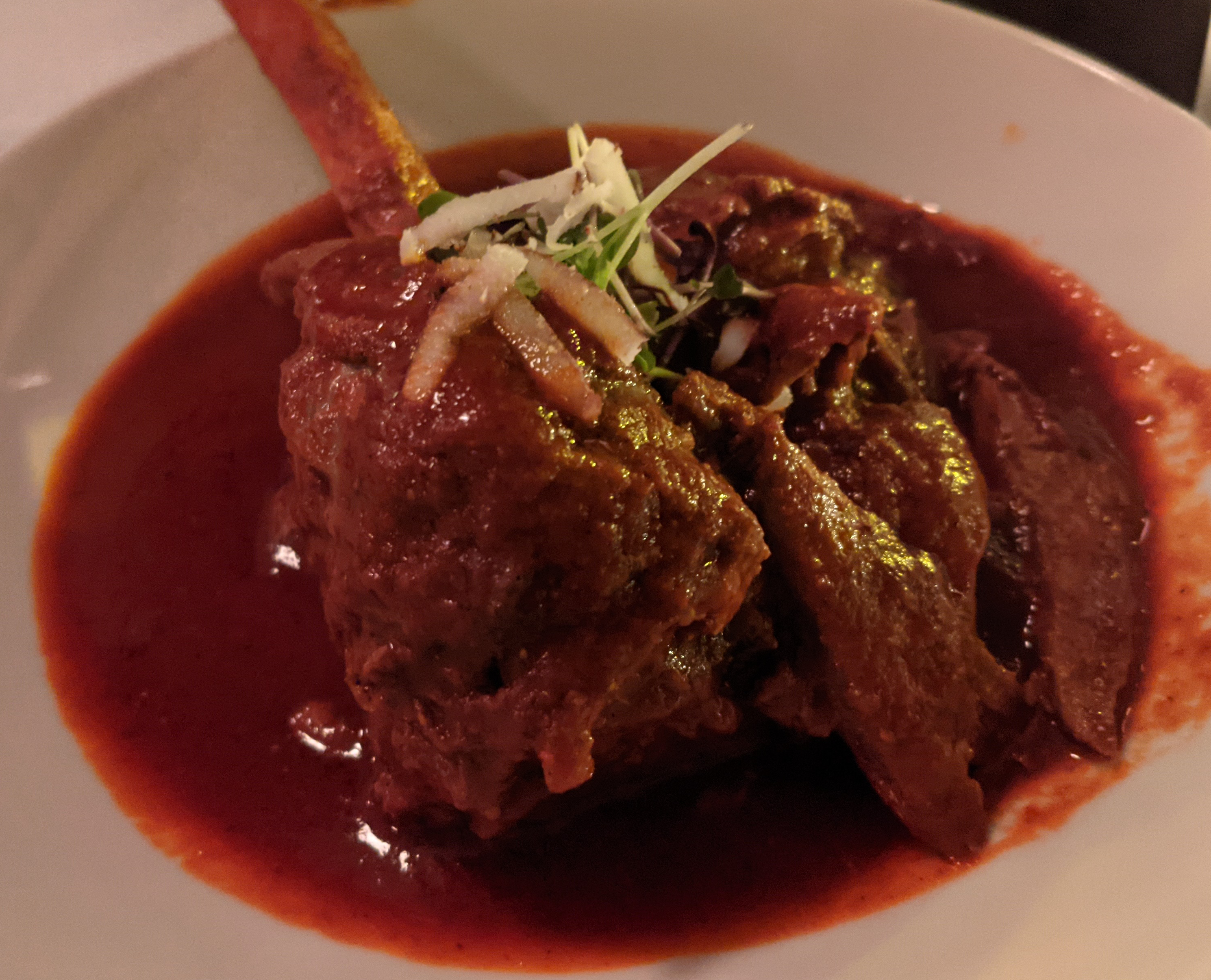 Finally, the lamb shank. We were not wrong; we didn’t even touch the scary knives. The meat melted off the bone with the smallest flick of a fork, or if you just looked at it and willled it to fall off. It had the distinct flavor of lamb without the strong gaminess that sometimes happens. The sauce was spicy on its own but even better with the chutneys. It reminded me more of a Mexican mole than a traditional Indian sauce, with a great, smoky flavor like guajillo chilis and dark fruits. It was absolutely delicious.