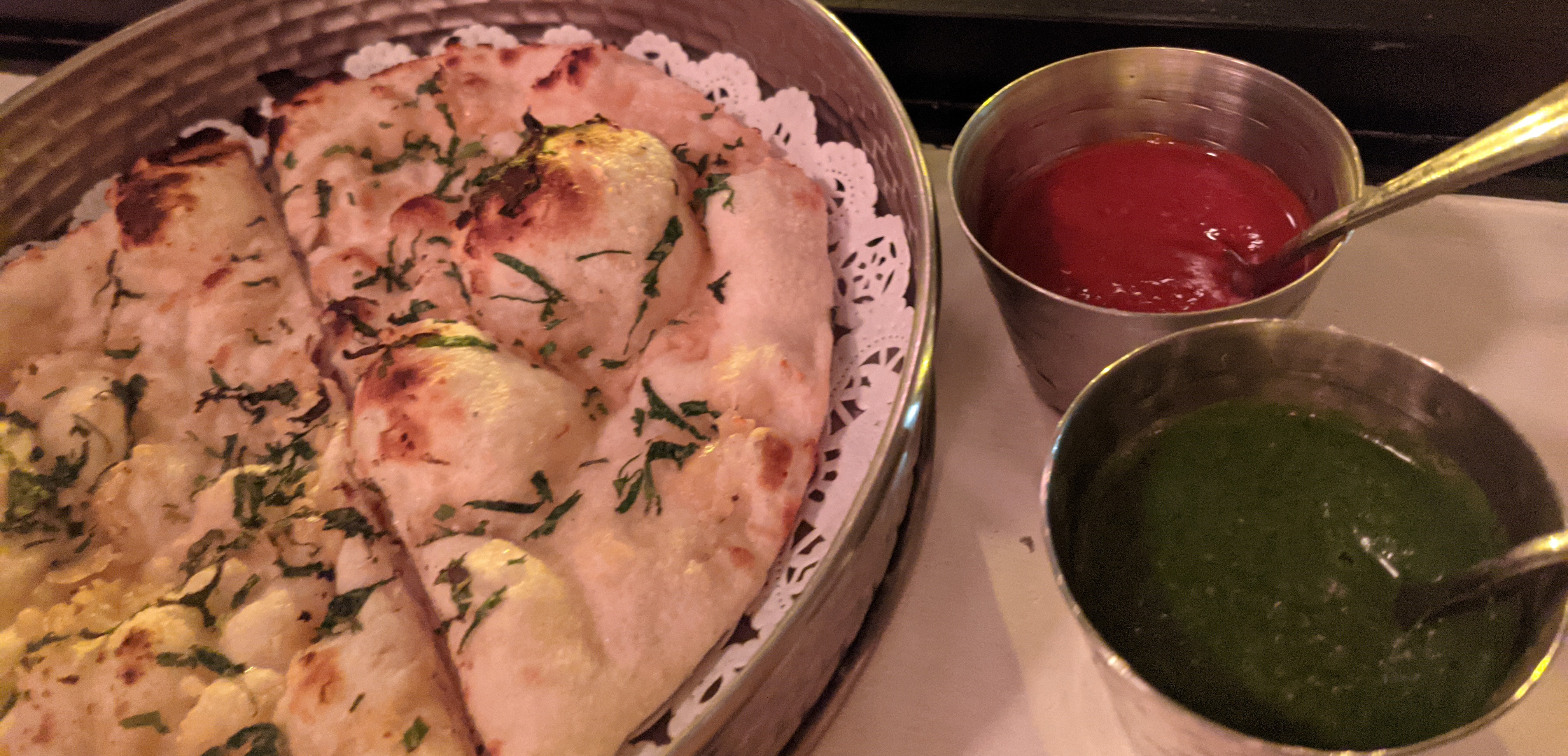 Pictured above: garlic naan (good, crispy, surprisingly small), our [red] habañero chutney (great, acidic heat), the green chutney (we ordered sour cherry and although I strongly suspect this was the chimichurri chutney, I’m not upset), and the pumpkin (aka kabocha squash, not actually pumpkin). I absolutely loved this dish with its sweet heat and hearty spices. It went great with the red chutney too.