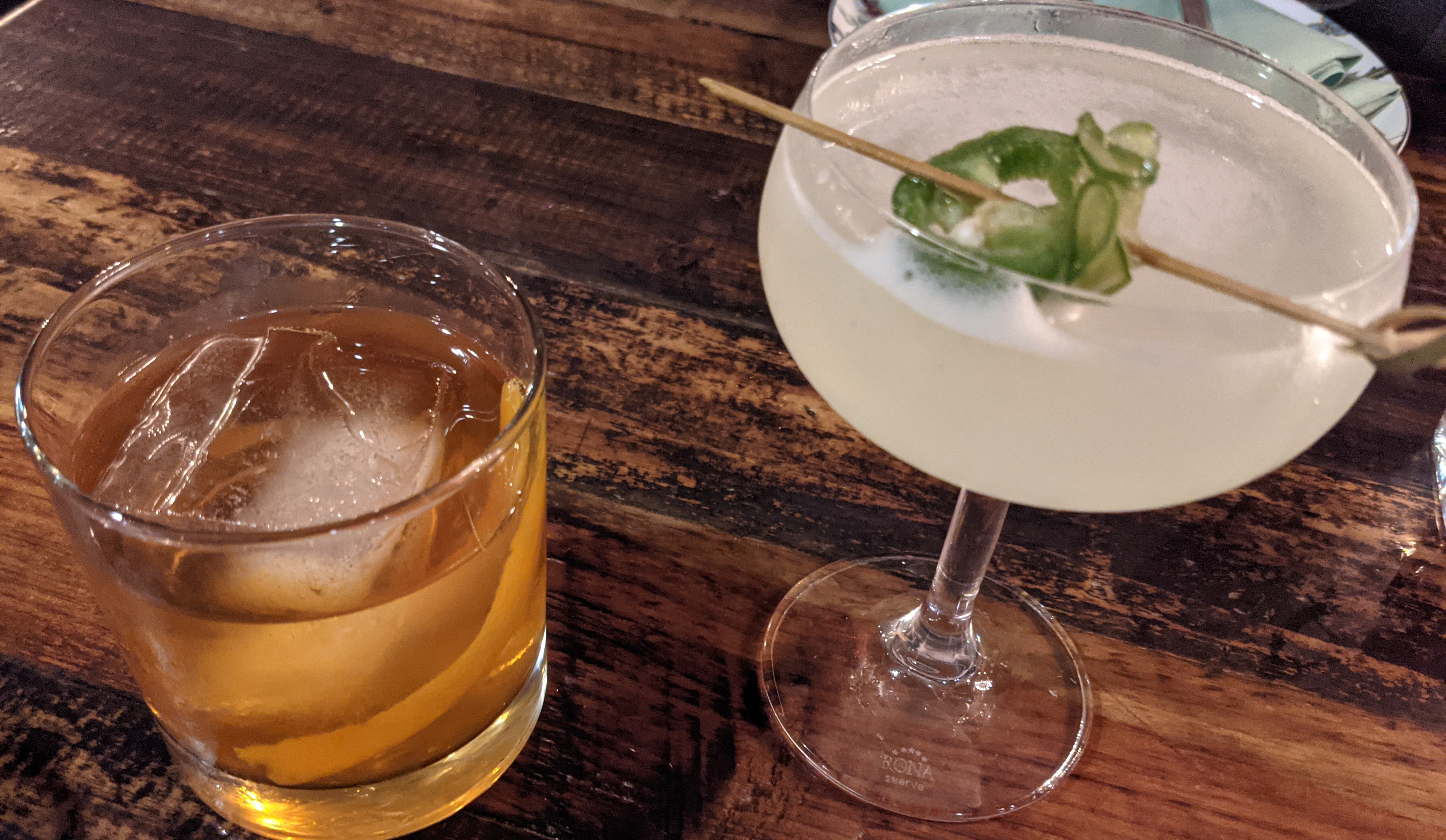 To start off, we ordered from their tasty-looking list of house cocktails. I had the El Placer (left), entirely because it advertised cardamom-infused pisco. My husband asked for the Santo Pecado (right). The El Placer had a definite tinge of cardamom without being overwhelming, and a bitterness and light smoke from the unnamed whiskey (possibly Scotch?) The Santo Pecado had a small punch of jalapeño heat without the vegetal flavor that sometimes comes with chile infusions, and a nice, citrusy flavor for balance. We ended up swapping drinks, but would have been happy either way.