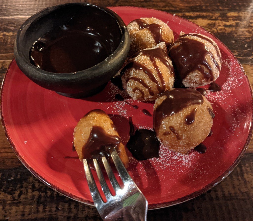 It should have ended there, with us feeling satiated but not full full. I even said, “I don’t want dessert, I’m feeling like I ate the correct amount.” But then the server dropped a plate of unordered buñuelos on our table for no apparent reason and I was like, “NEVERMIND!” Doughy, yeasty balls of joy with thick, rich chocolate sauce. It was also correctly-sized, especially for a dessert, although who includes five of anything on a shareable plate? Even numbers, people!